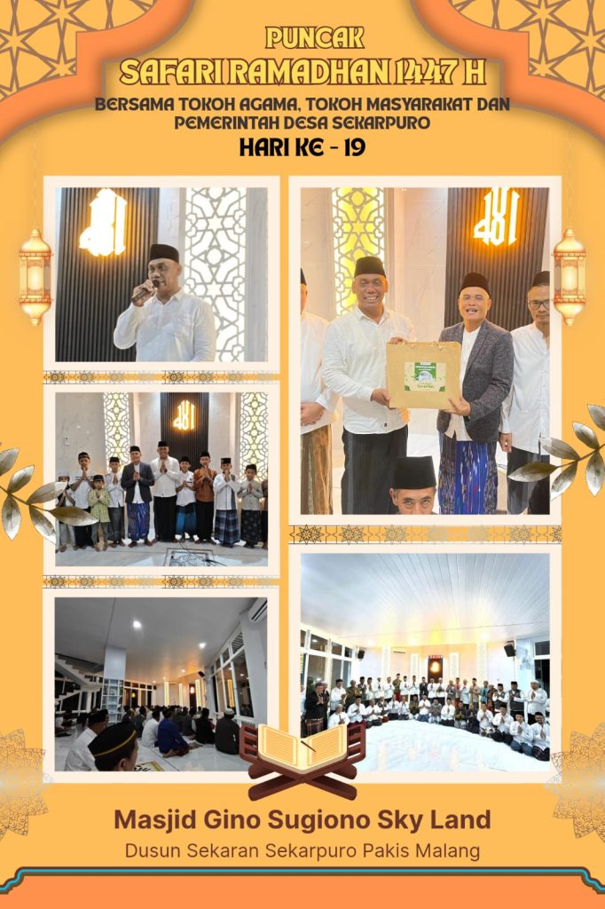 Sekarpuro, Pakis (11 Maret 2026) – Suasana khidmat dan penuh kehangatan menyelimuti Masjid Gino Sugiono, Perum Skyland, Dusun Sekaran pada malam puncak rangkaian Safari Ramadhan Pemerintah Desa Sekarpuro. Acara ini menjadi momentum penting dalam mempererat tali silaturahmi antara jajaran perangkat desa dengan warga masyarakat di penghujung bulan suci.