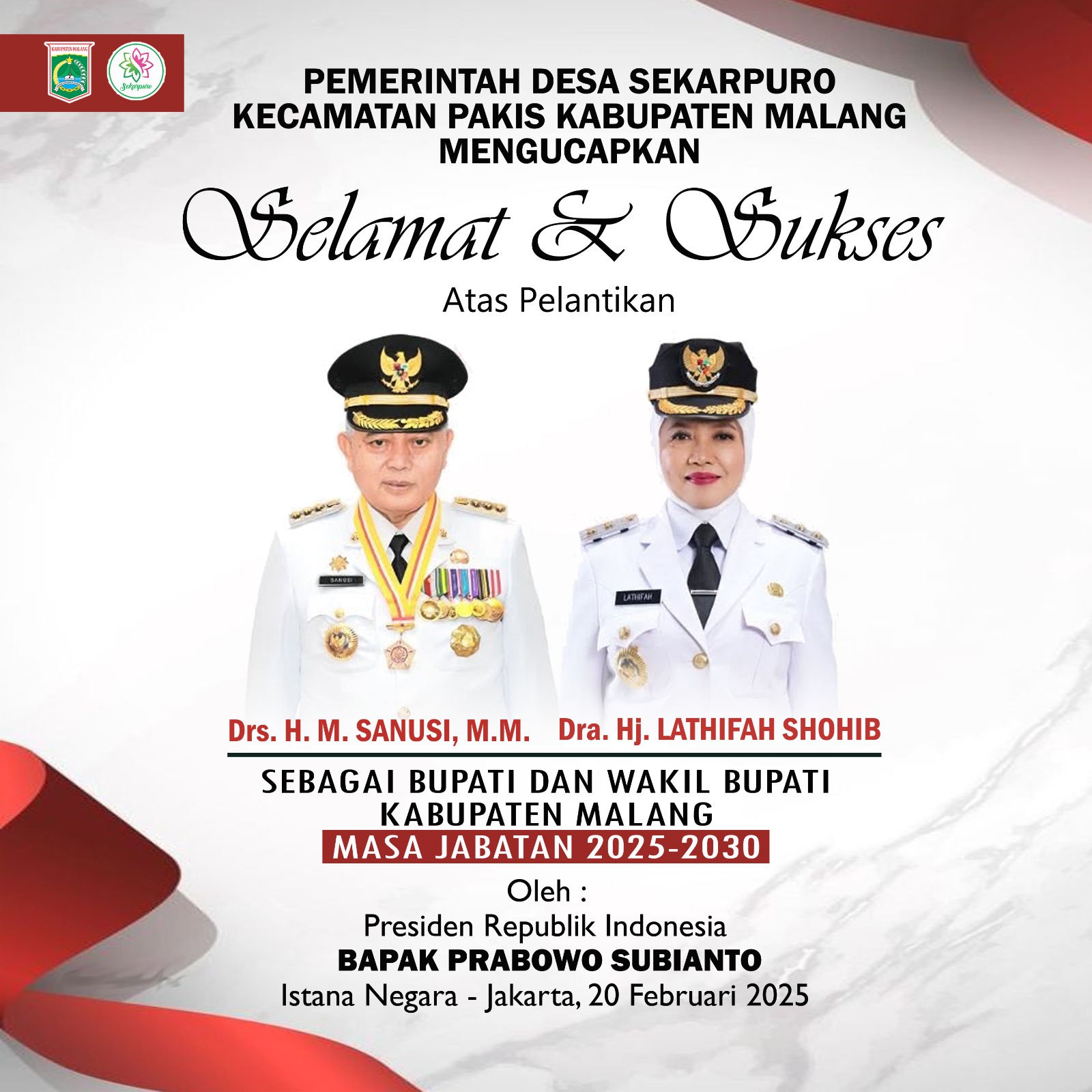 Jajaran Pemerintah Desa Sekarpuro Kecamatan Pakis Kabupaten Malang mengucapakan Selamat & Sukses atas dilantiknya Drs. H.M. Sanusi, M.M dan Dra.Hj. Lathifah Shohib sebagai Bupati dan Wakil Bupati Kabupaten Malang Periode 2025-2030. Oleh Presiden Republik Indonesia Bapak Probowo Subianto. Di Istana Negara – Jakarta, pada tanggal 20 Februari 2025.