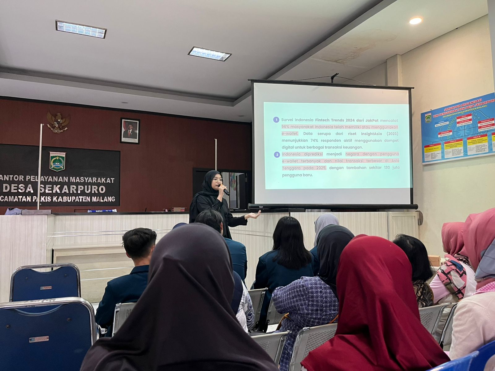 Pada Sabtu, 5 Juli 2025, mahasiswa KKN FIA UB Kelompok 26 menyelenggarakan kegiatan Peningkatan Literasi Keuangan Digital bagi UMKM yang bertempat di Balai Desa Sekarpuro. Pada kegiatan ini, Mahasiswa FIA UB berkesempatan untuk mengundang salah satu pemateri yang memiliki keahlian pada bidang keuangan digital yaitu kak Haya Ailiya Fitarakhman. Sosialisasi ini diperuntukkan bagi pelaku Usaha Mikro, Kecil, dan Menengah (UMKM) sebagai bentuk dukungan terhadap digitalisasi usaha dan peningkatan pemahaman masyarakat terhadap sistem keuangan modern.