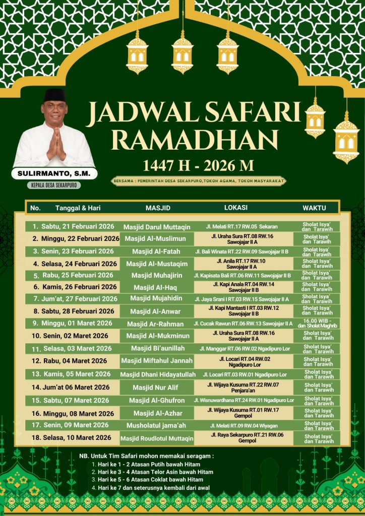 SEKARPURO – Bulan suci Ramadan 1447 H di Desa Sekarpuro tahun ini disambut dengan semangat syiar yang luar biasa. Guna mempererat tali silaturahmi antara umaro (pemerintah), ulama, dan umat, Pemerintah Desa (Pemdes) Sekarpuro resmi meluncurkan program Safari Ramadan: Tarawih Berjamaah Keliling.